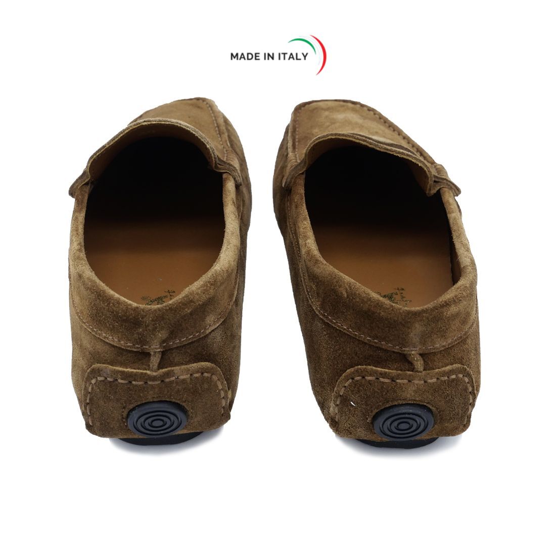 Mocassino in camoscio con laccetti, cucito a mano, flessibile e leggero